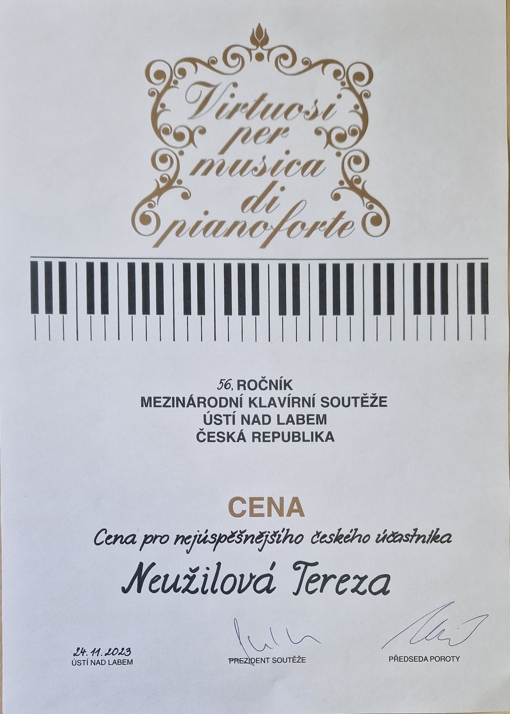 - Vladimír Kuželka (klavírní třída doc. MgA. Romana Friče, Ph.D.) - 1. cena ve III. kategorii + titul laureáta (Velikost: 69.54 kB) a cena poroty za interpretaci skladby Vítězslava Nováka (Velikost: 81.84 kB)