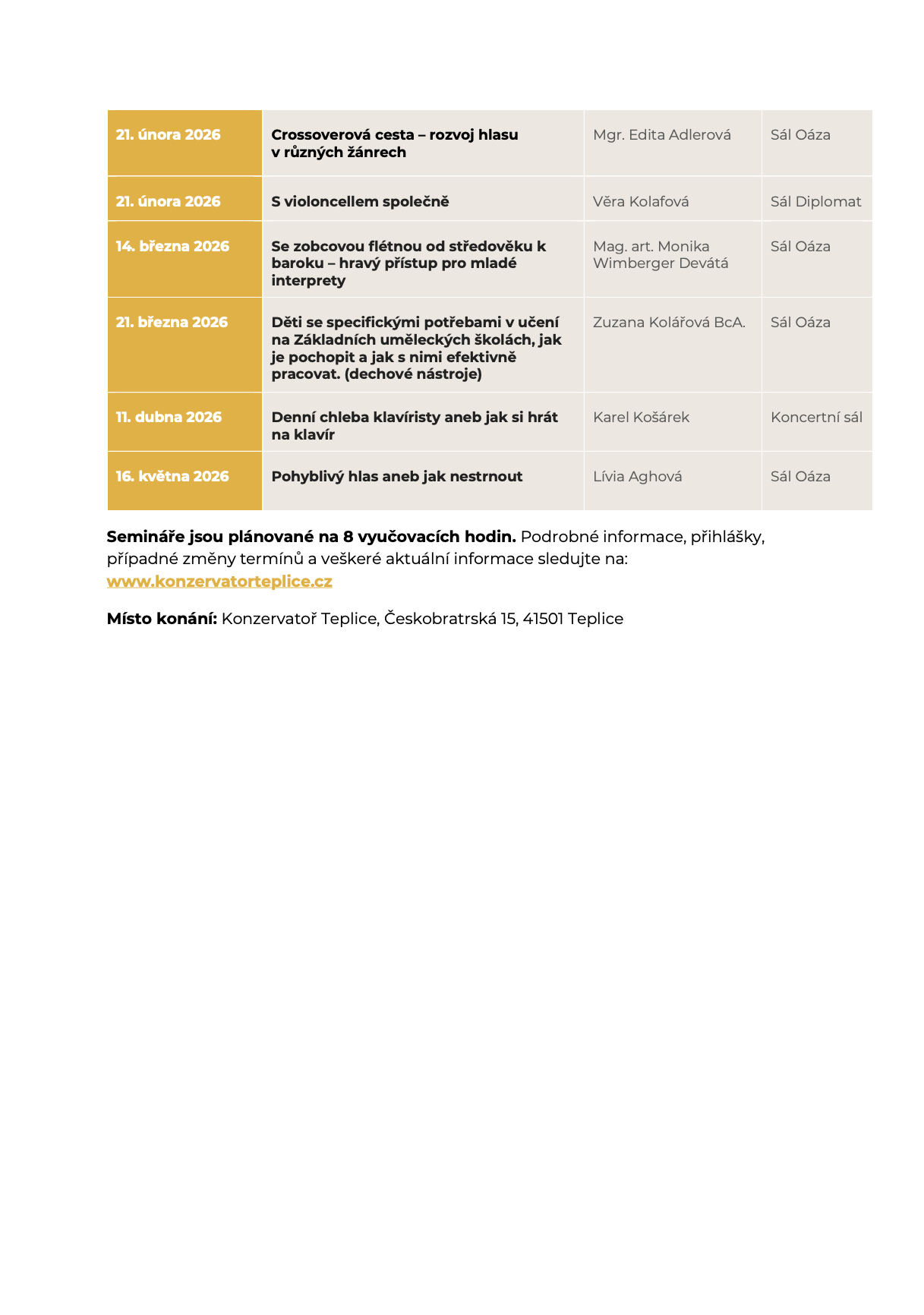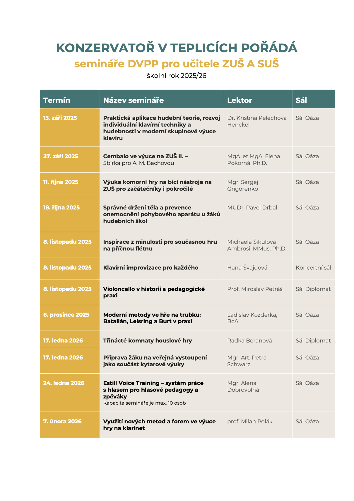 V letošním školním roce pokračujeme v tradici pořádaní odborných seminářů v rámci dalšího vzdělávání pedagogických pracovníků (DVPP), které jsou určeny učitelům ZUŠ a SUŠ. Naším cílem je nabídnout inspiraci pro výuku, sdílení zkušeností i prostor pro setkávání pedagogů z různých regionů. Semináře vedou zkušení lektoři z řad konzervatorních a vysokých školských pedagogů, koncertních interpretů a metodiků, kteří se dlouhodobě věnují práci s dětmi i mladými umělci.